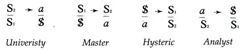 It is known, of course, that the four discourses are neatly organised in such a way that each one is articulated through a rotating series of quarter turns, forming a closed circuit:For example, see Lacan’s Seminar XVII, The Other Side of Psychoanalysis.16